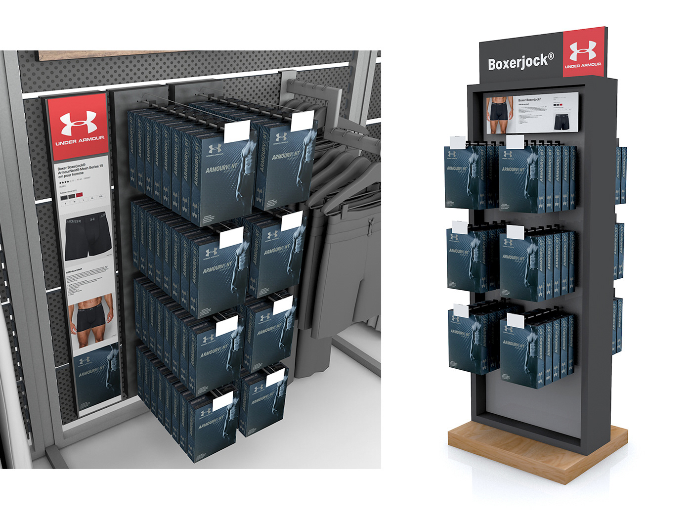 Création des Corners Shop-in-Shop Under Armour et installation chez les distributeurs Intersport et Go Sport.