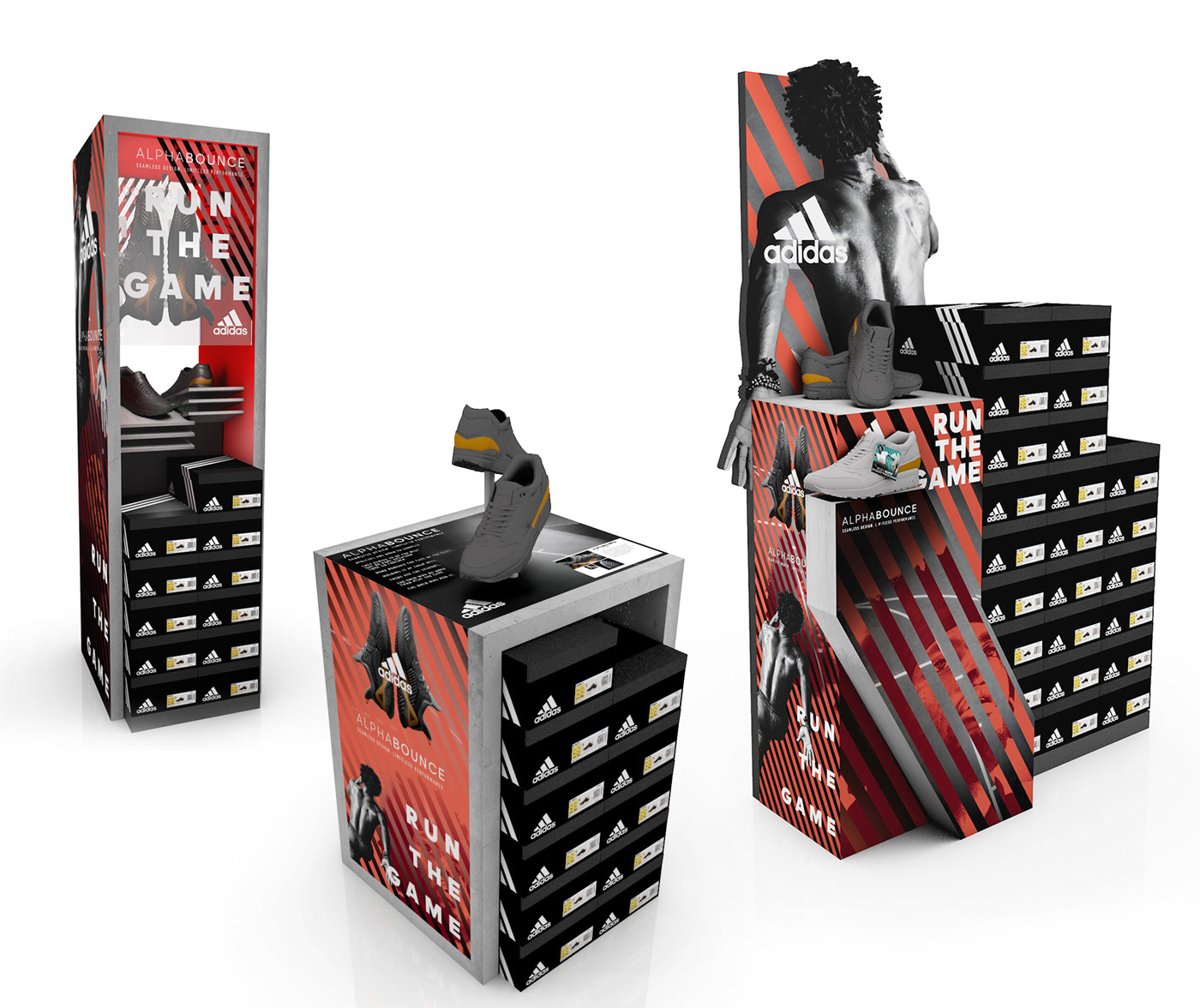 Création du display adidas Alphabounce. Notice de montage animée. Prototypage. Production. Installation en magasin.