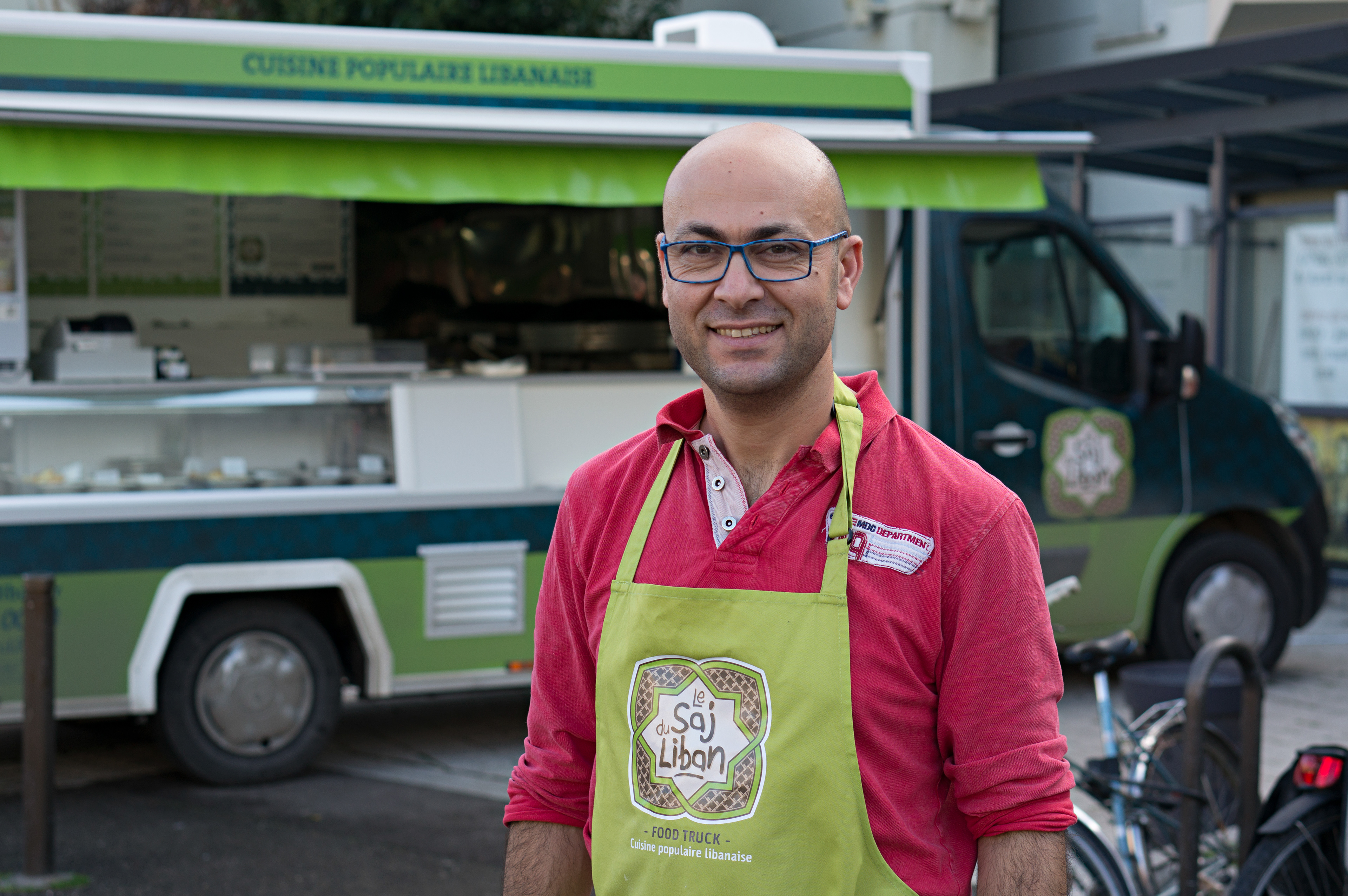 Le Saj du Liban, cuisine populaire libanaise. Création de la charte graphique et déclinaisons sur tous les supports : logo, covering du food truck, menu, webdesign, tablier, cartes de visites, flyer...