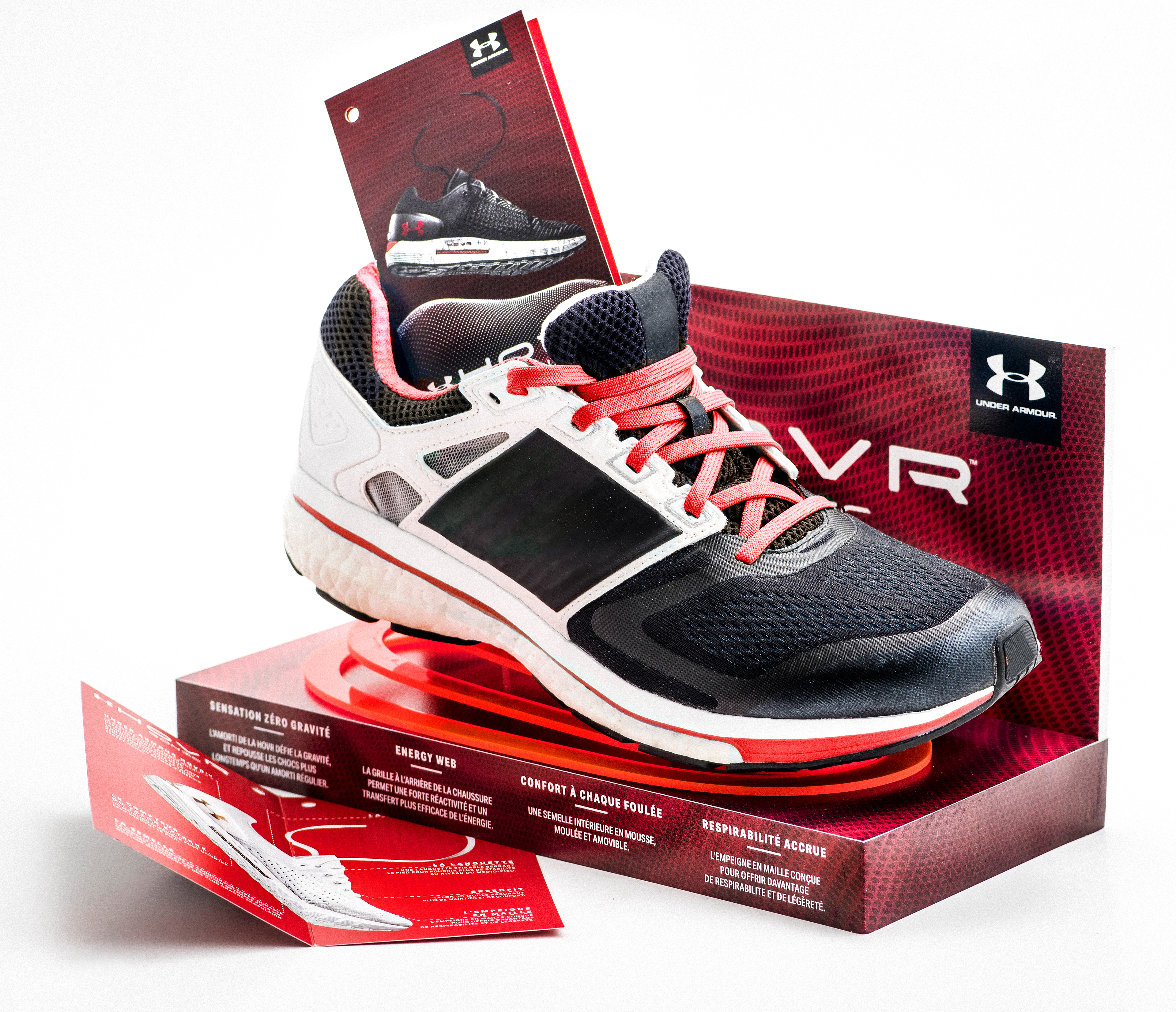 Design et production des shoes riser Hovr Under Armour. Implantation dans les magasins Intersport.