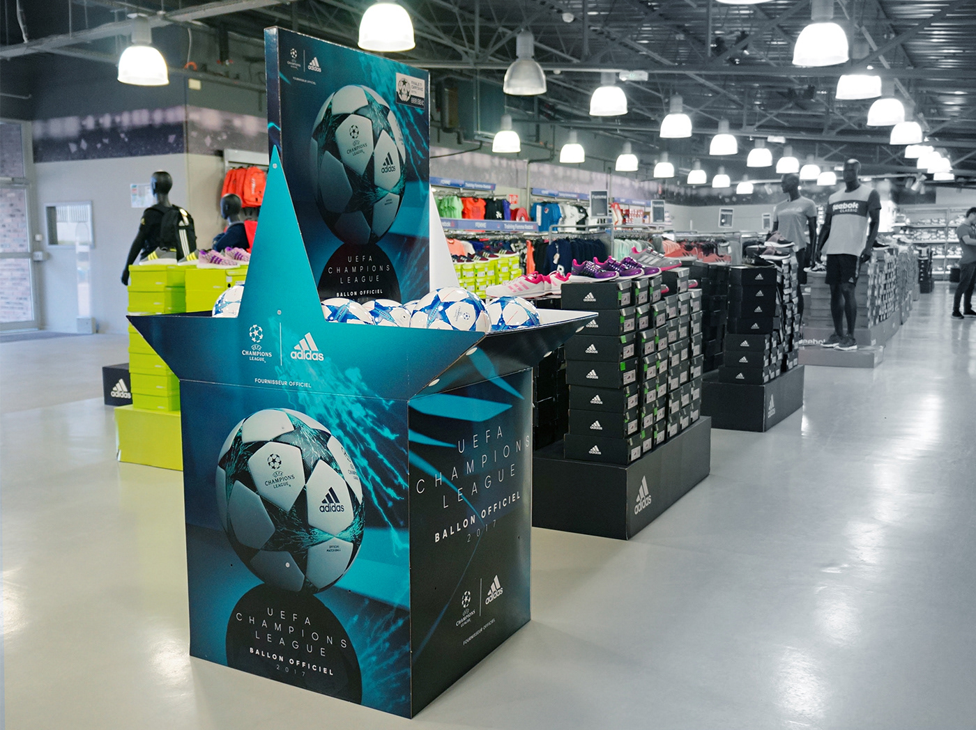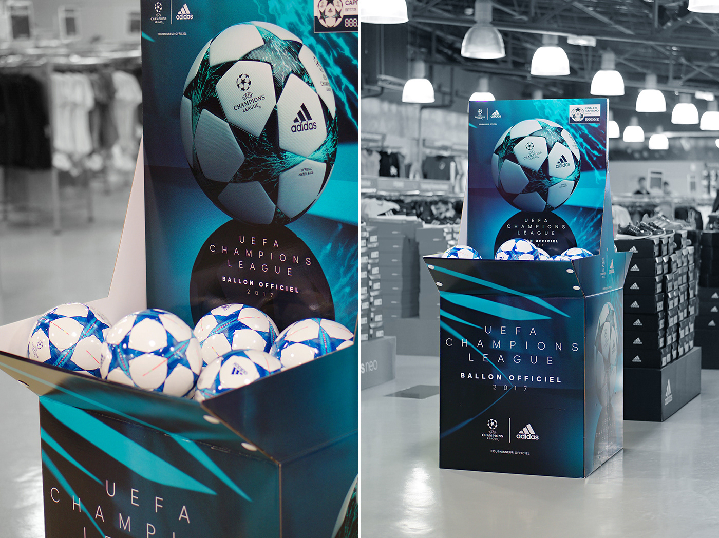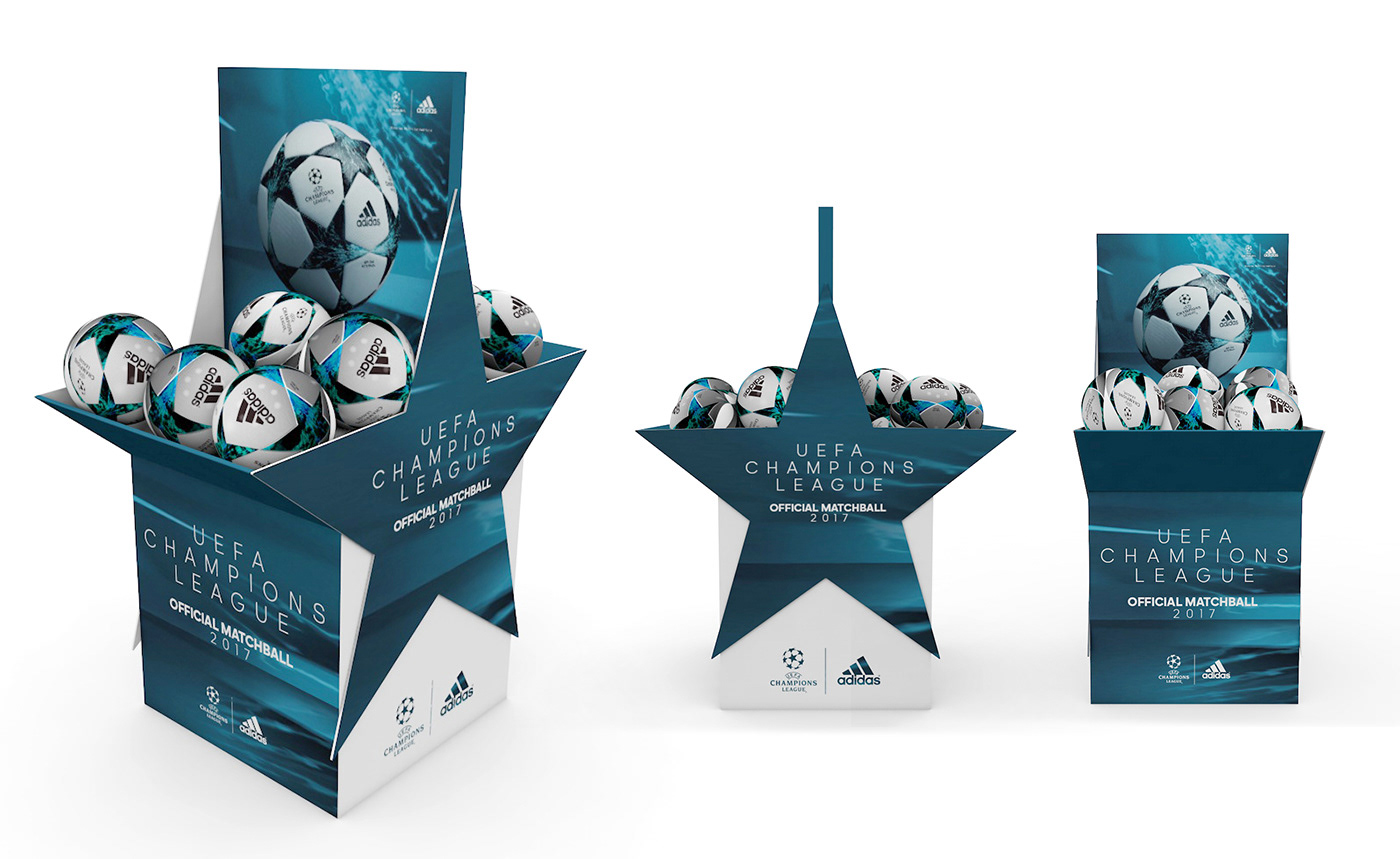Box Ballon UEFA Champions League 2017. Création - design de la box palette plv en adéquation avec le KV fournis par Adidas. Prototypage, production, installation en magasin, reporting photo.