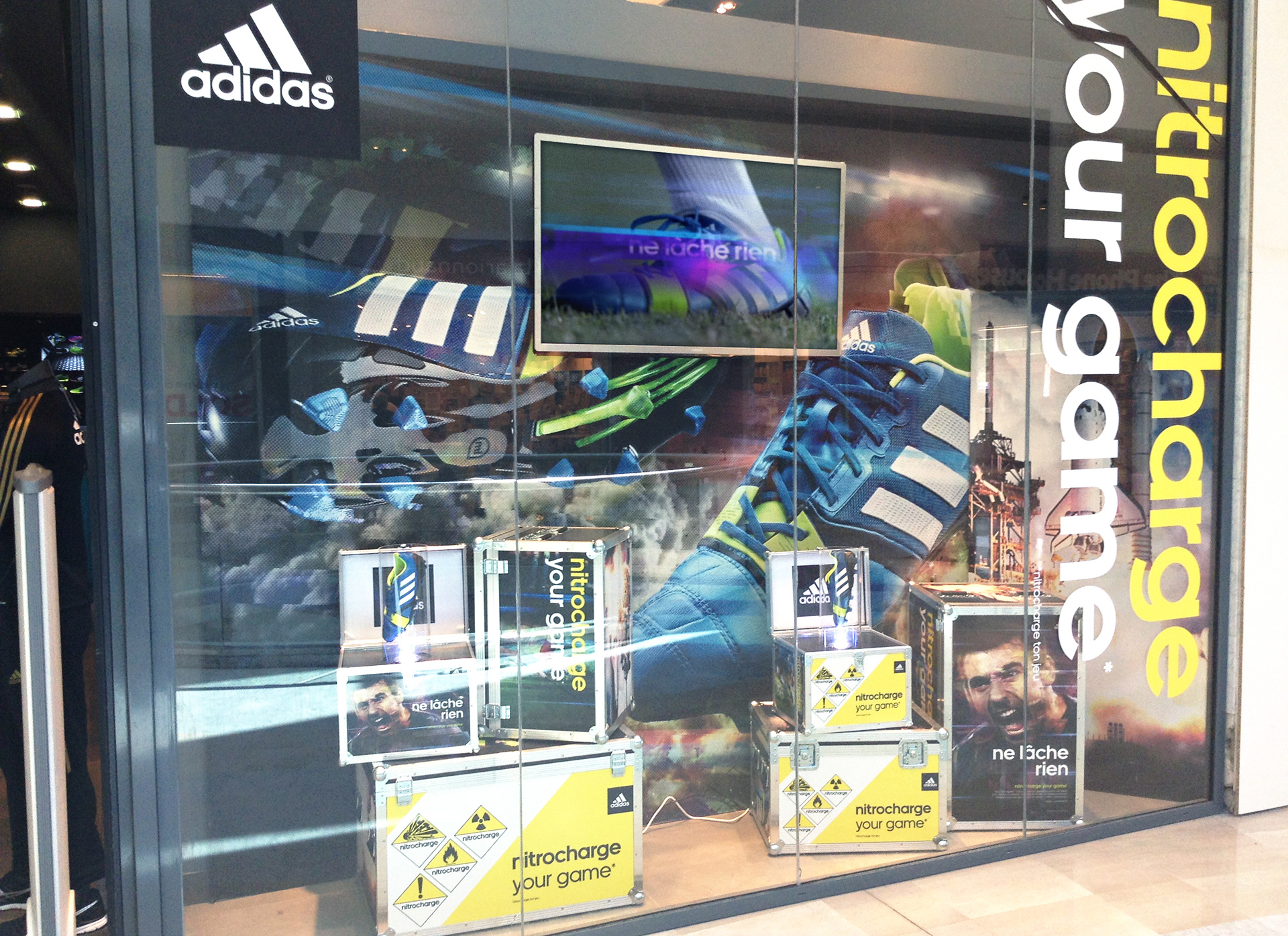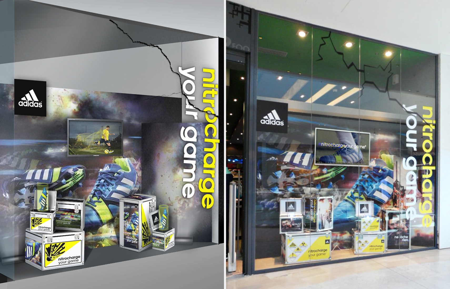 Création - théatralisation d’une vitrine sur le thème des matières dangereuses. Déploiement dans le réseau de magasin +2FOOT. Utilisation de photo de la campagne adidas Nitrocharge ©