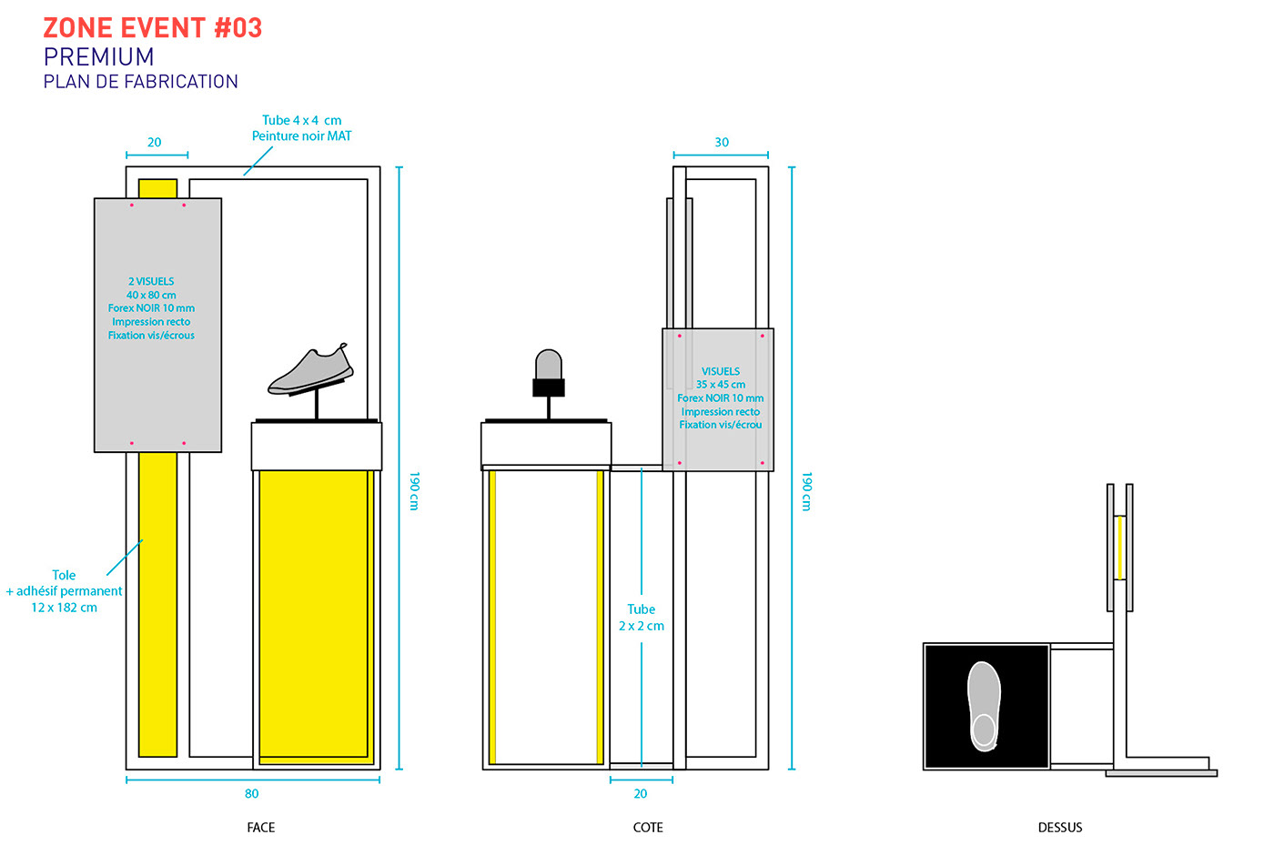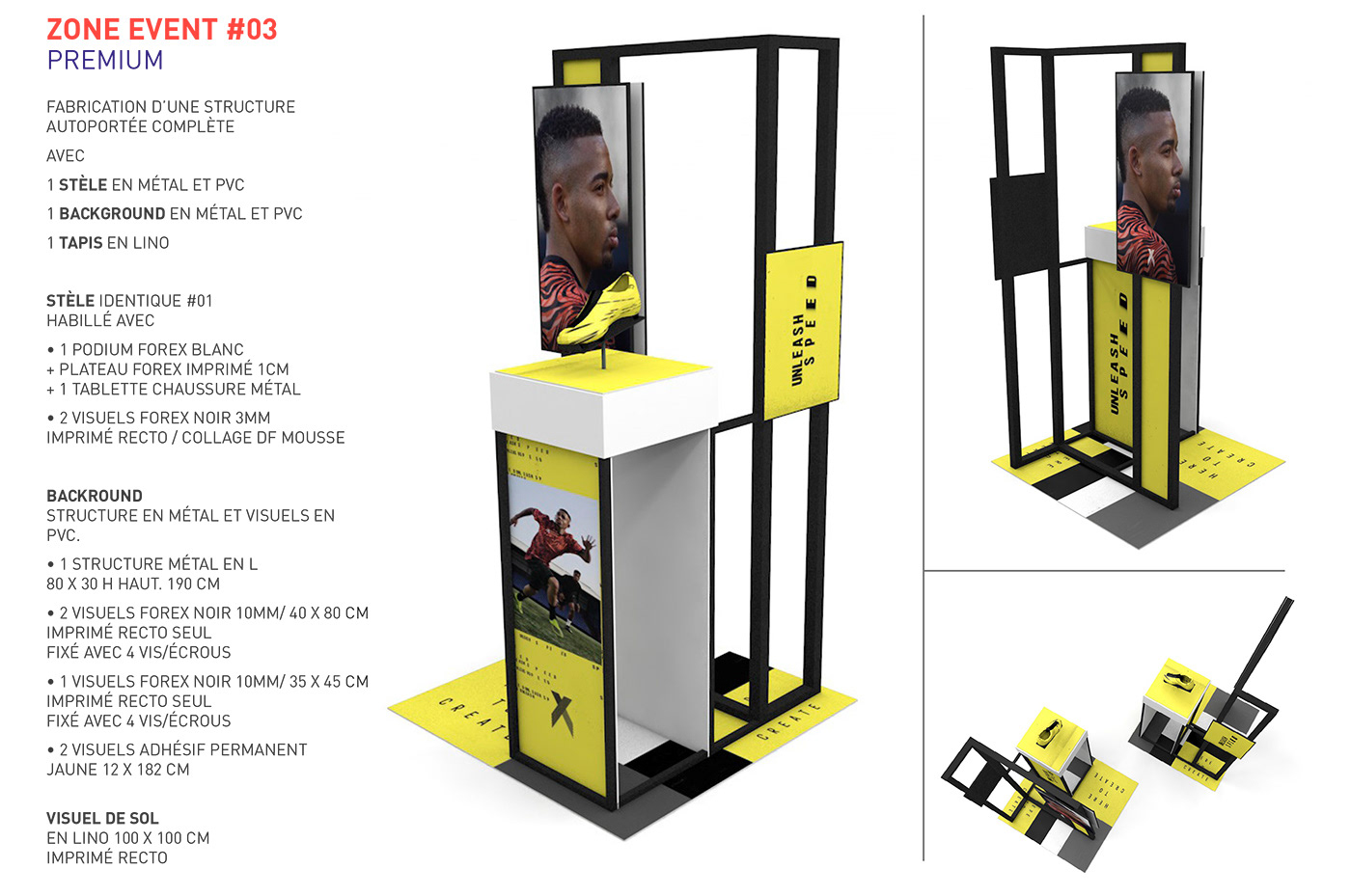 Création d'une zone-event pour le lancement des chaussure de foot adidas X. Présentation sous forme de simulations 3D et d'animations vidéos.